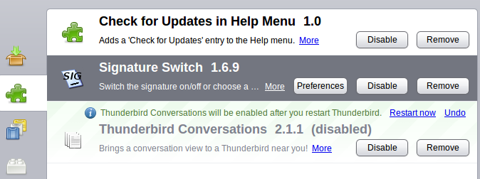 Using the Add-ons Manager, you can quickly and easily enable or disable any of your installed add-ons. Why would you want to do that? When you upgrade Thunderbird, the application disables all third-party add-ons (ones that you didn't install from the Mozilla website). In that case, you'll need to re-enable those add-ons.